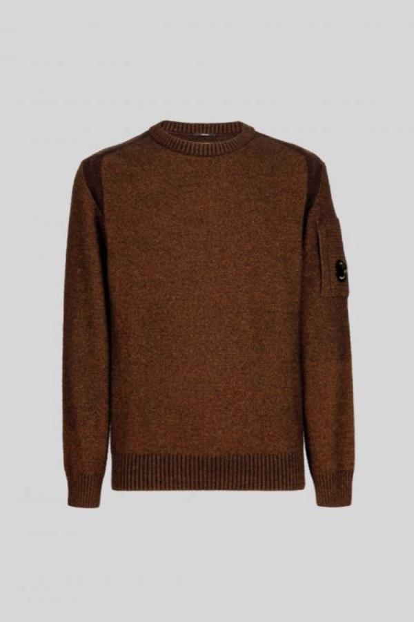 Trui CP Company bruin (Bronze Brown) met ronde hals en en zakje met ritssluiting en goggle op de linkermouw. De trui is gemaakt van een fijne polyamide/wol kwaliteit.