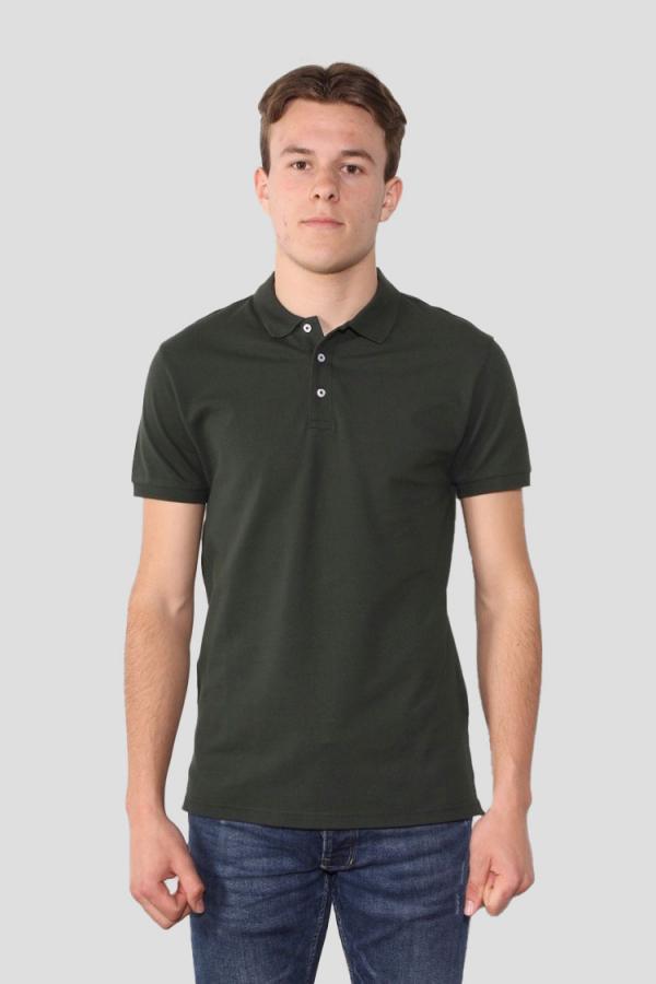 Polo Colmar donkergroen. De polo is gemaakt van katoen met elastan. Het rode logo staat op de linkermouw. Het model is 1.83 m lang en draagt maat M.
