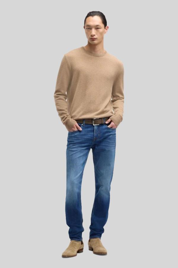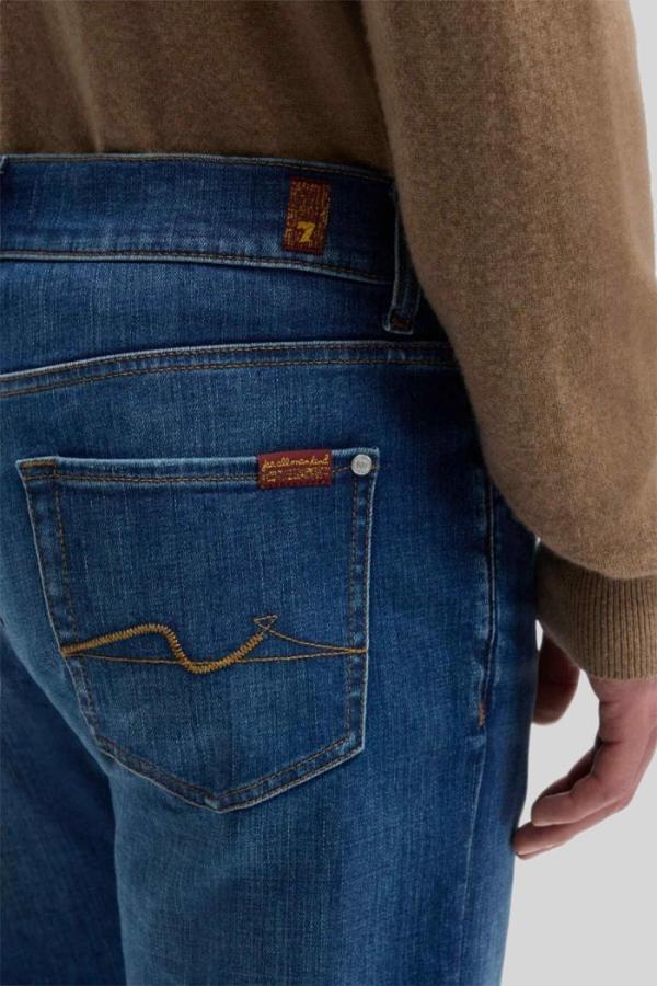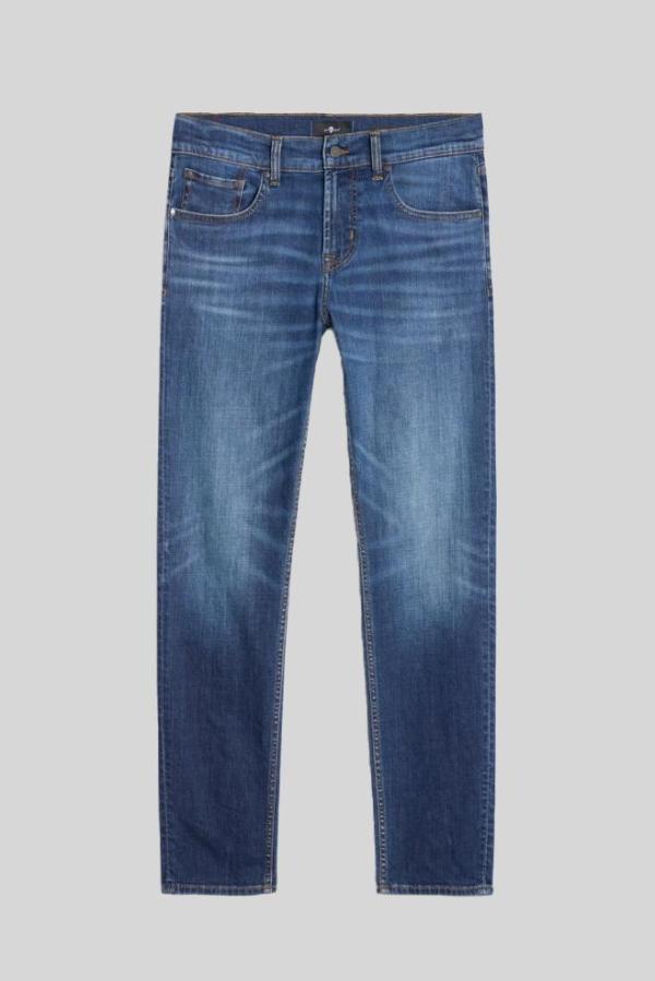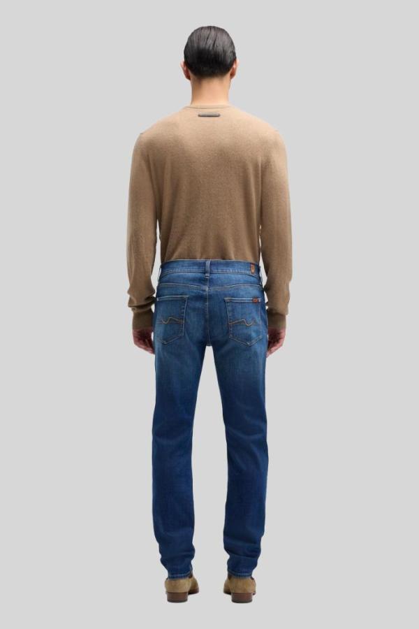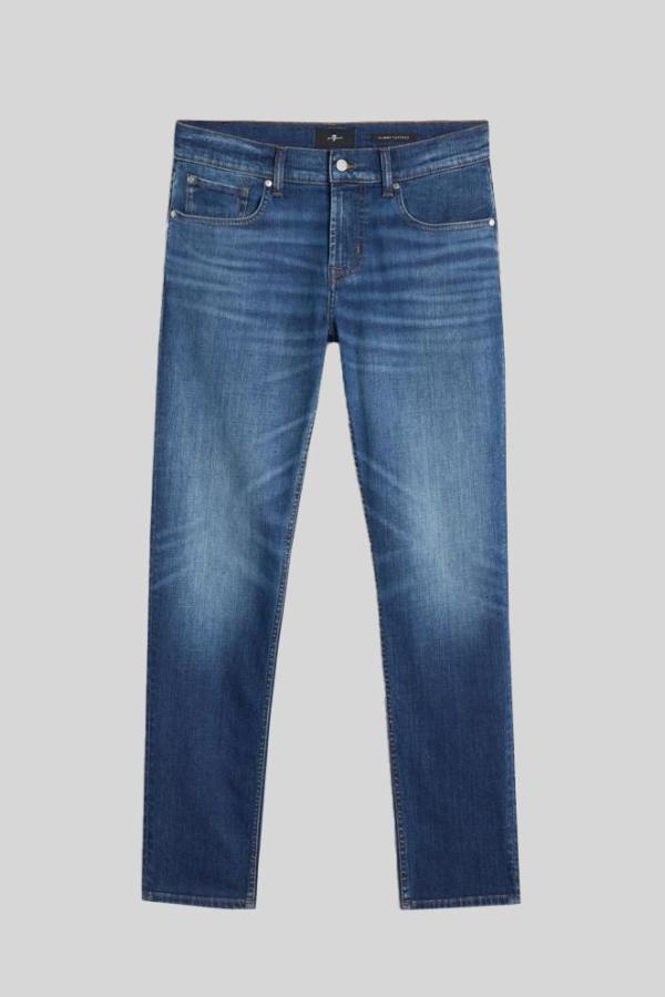 De ‘7 For All Mankind Slimmy Tapered Ambition’ jeans in een middenblauwe kleur met lichte washing op de bovenbenen biedt een perfecte mix van stijl en comfort. Met een middelhoge taille en slank toelopende pijpen heeft deze spijkerbroek een moderne pasvorm. Gemaakt van luxe stretchdenim voor optimale bewegingsvrijheid.