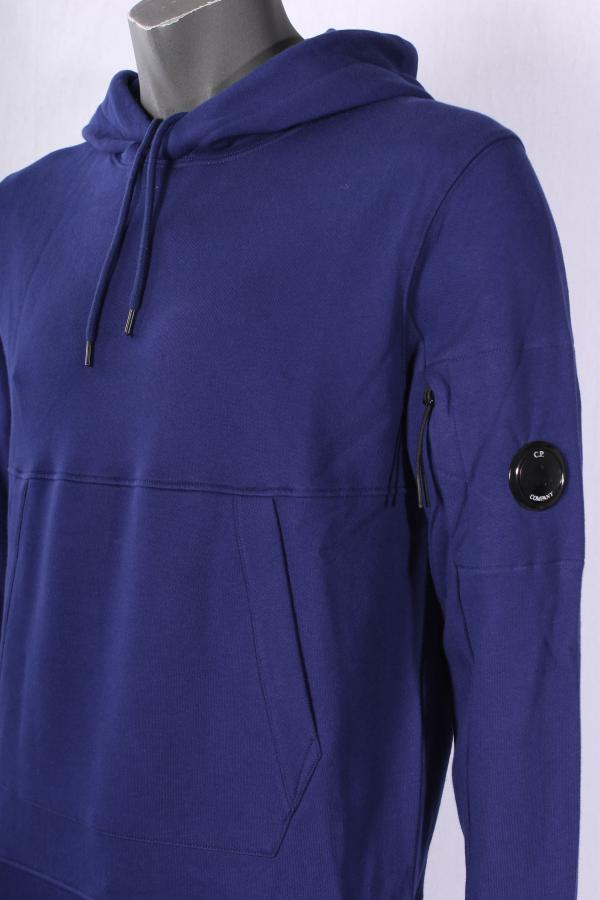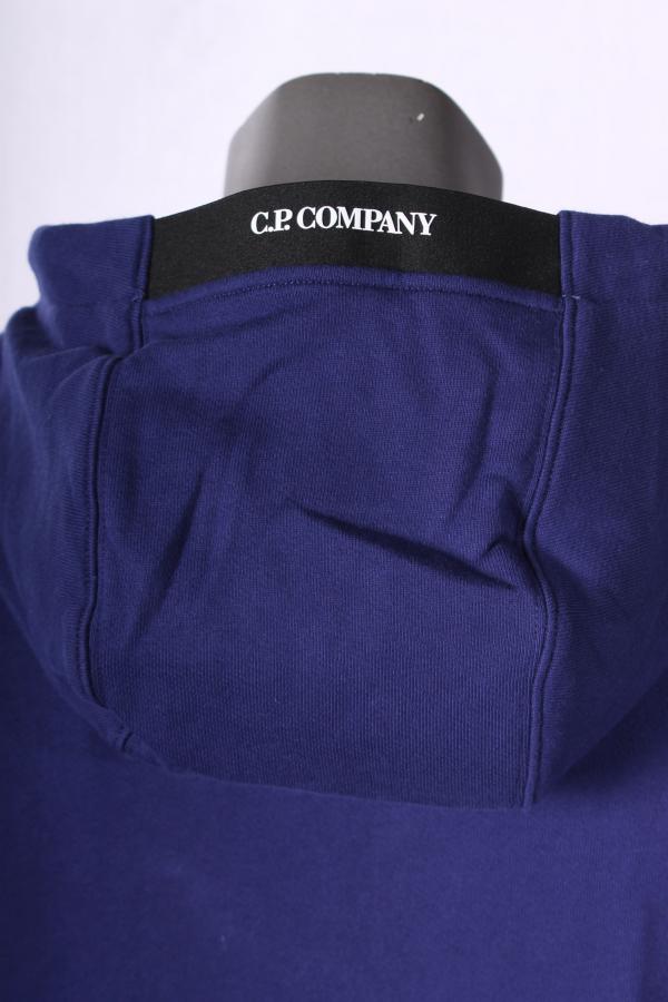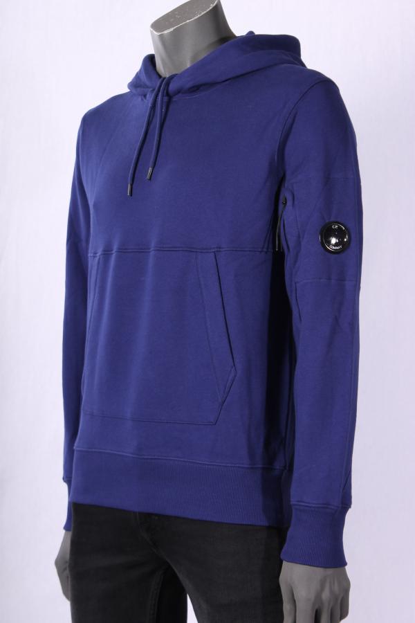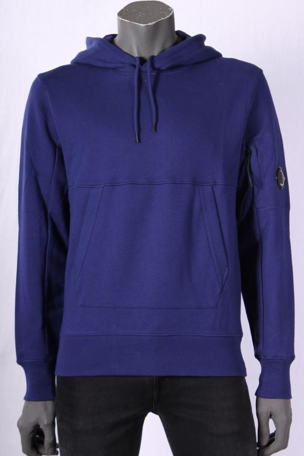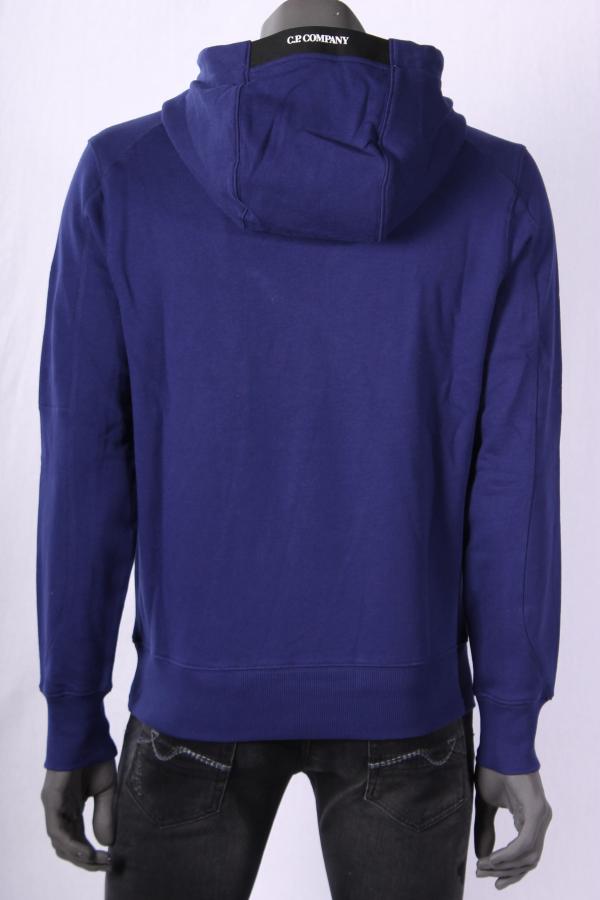 Hoodie C.P. Company inktblauw met buidelzak op de voorkant. De sweater heeft een elastieken boord en manchetten. Op de linkermouw zit een zakje met ritssluiting en goggle. De paspop draagt maat S.