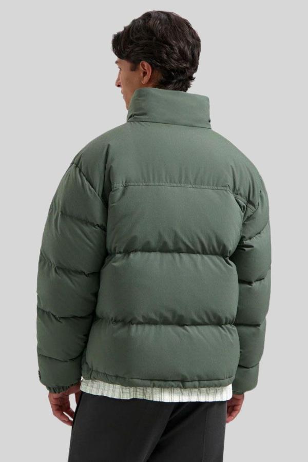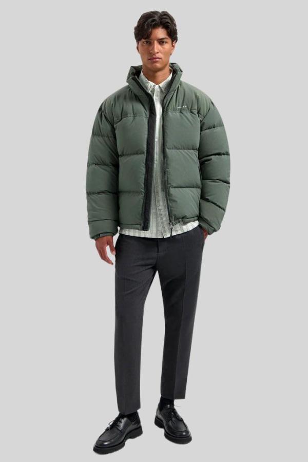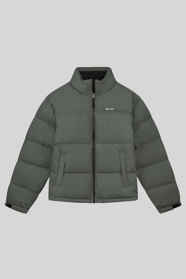 Jack Olaf ‘Puffer Jacket Dark Green’: donkergroen puffer jack van stevig polyester met donsvulling, blinde ritszakken en verborgen capuchon in de kraag. Het kleine logo op de borst en de strakke lijnen geven een tijdloze look. Warm, licht en comfortabel — perfect voor koude dagen en makkelijk te combineren!