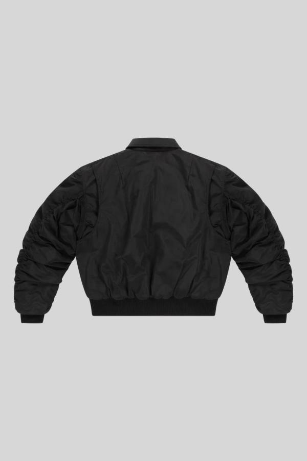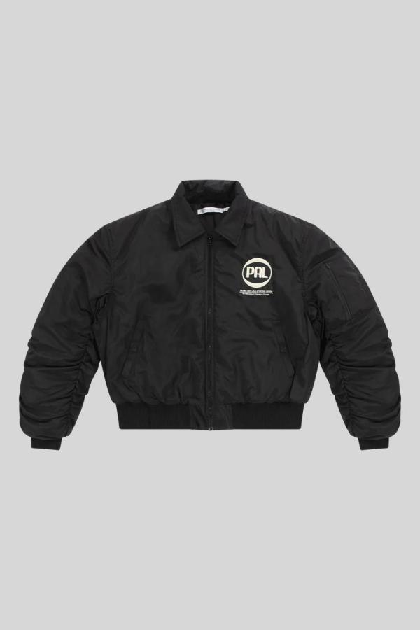 Jack van PAL Sporting Goods, model ‘Bomber Jacket’ in ‘Carviar’. Gemaakt van polyester met katoen-polyester voering. Voorzien van hemdkraag, steekzakken en PAL-logo op de borst. Comfortabel, sportief en modern met boxy fit en wijde mouw – een korte bomber met stijl!