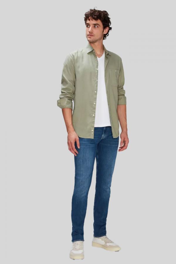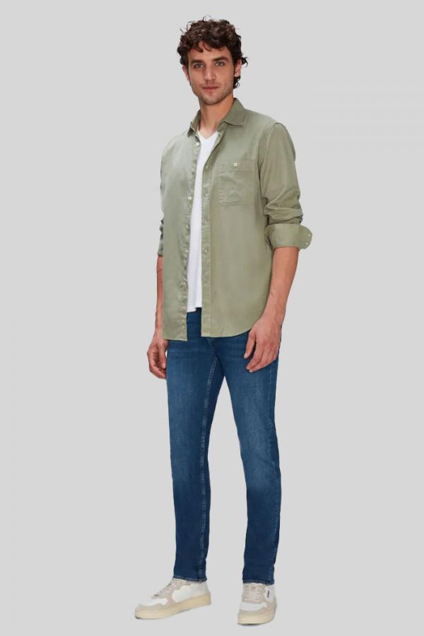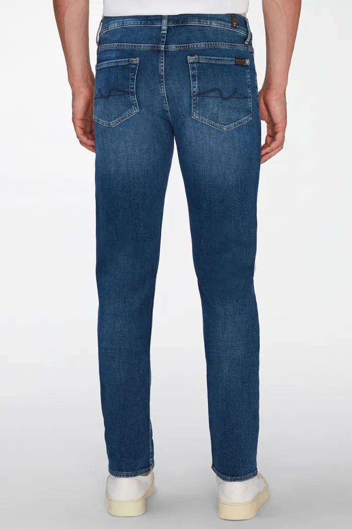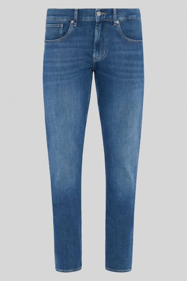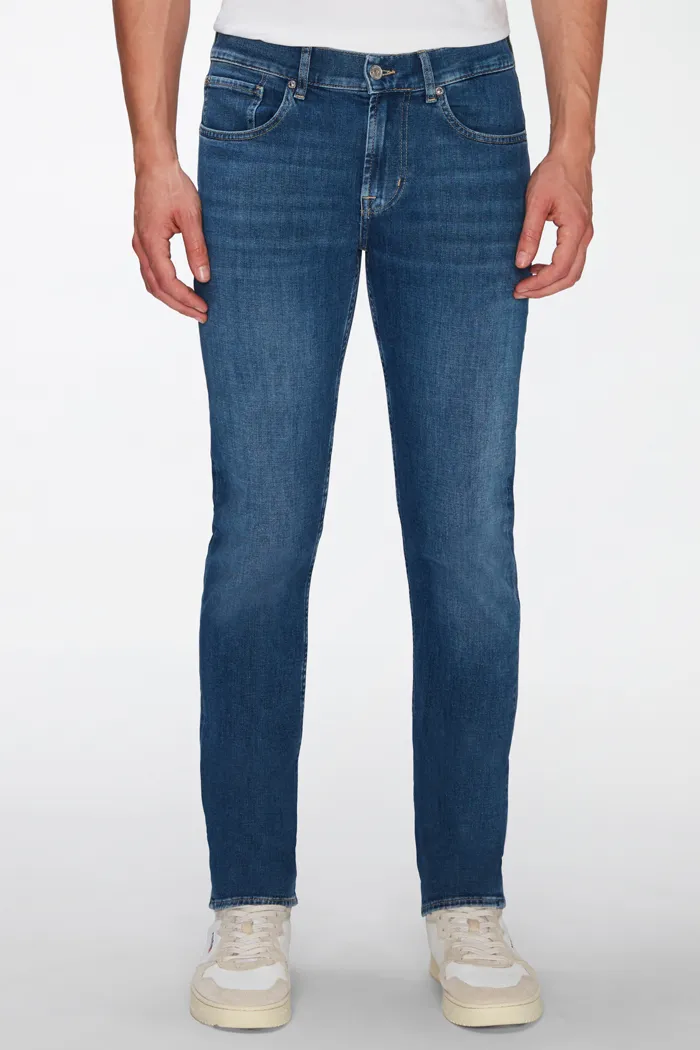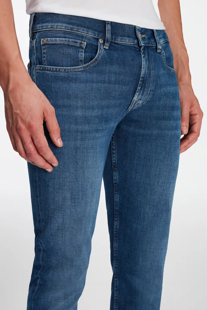 Jeans 7 For All Mankind in model ‘Slimmy tapered’. De blauwe skinny fit spijkerbroek heeft een ritssluiting. Het model draagt maat 32.