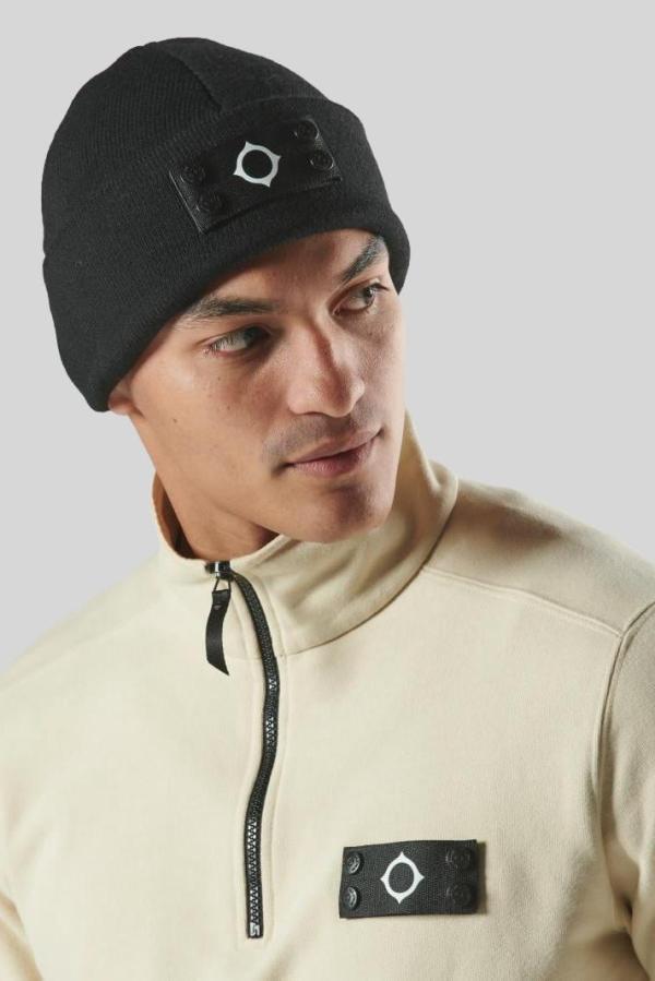 De Ma.Strum ‘Knitted Badge Beanie’ in Jet Black is een stijlvolle zwarte muts van 50% wol en 50% acryl. Voorzien van een logo op de omslag, biedt deze beanie zowel warmte als een moderne, casual uitstraling voor koude dagen!
