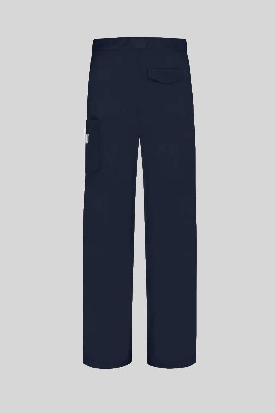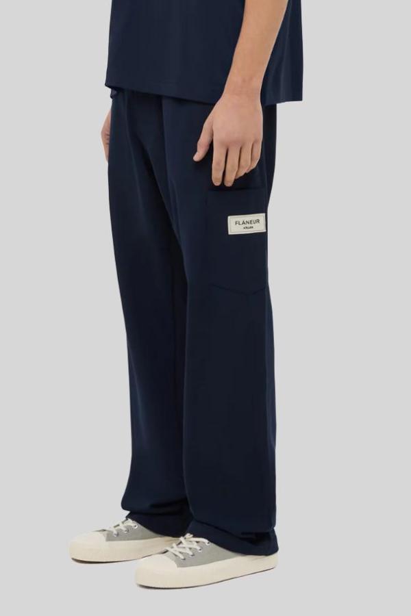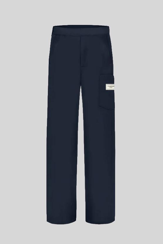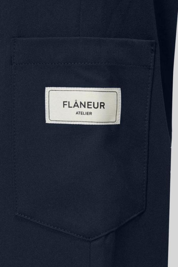 De Flaneur ‘Atelier Tailored Trousers Navy’ is gemaakt van 100% katoen. De relaxed fit blauwe pantalon met rechte pijp heeft een elastische band met koord en gulp met ritssluiting. De broek is voorzien van een opgestikte zak op het linkerbeen met ‘Flaneur Atelier’ label en een klepzak op de billen.