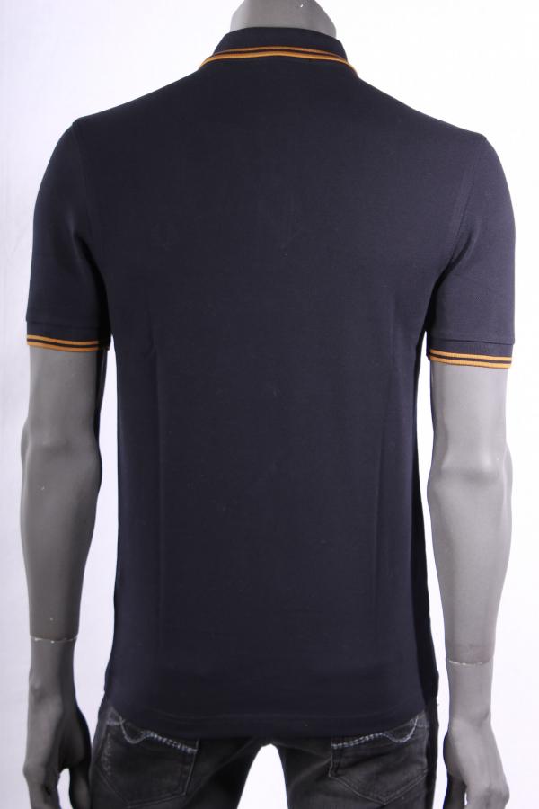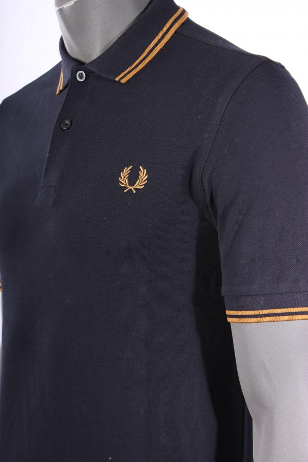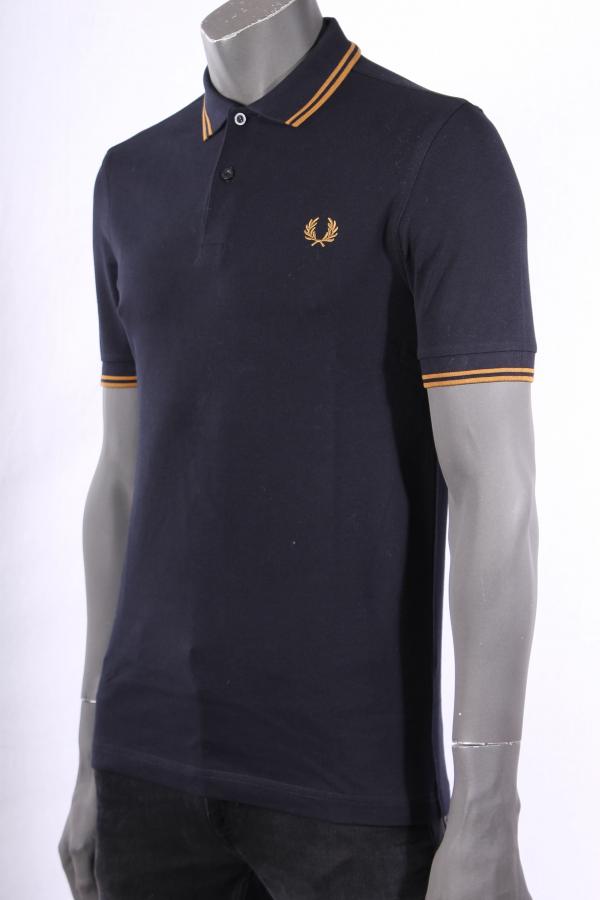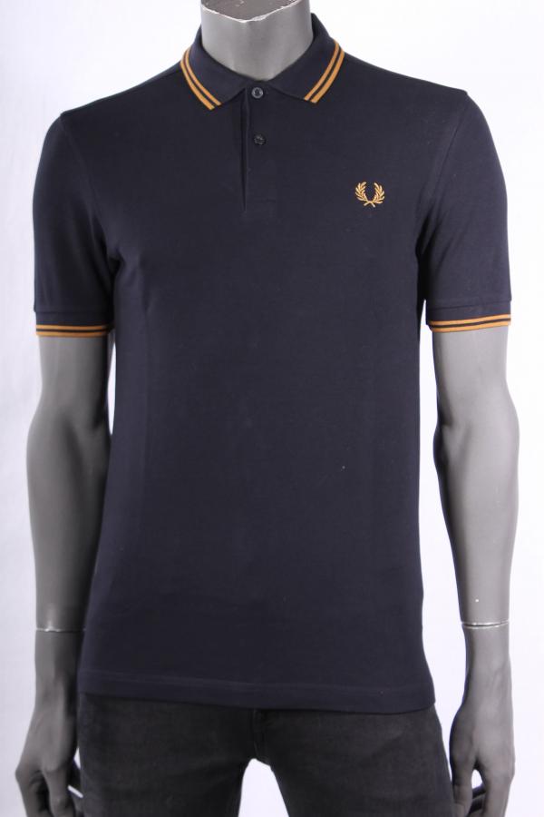 Polo Fred Perry donkerblauw met een caramelkleurige streep in de kraag en bij de mouwen. Het logo, de lauwerkrans, staat op de borst. De paspop draagt maat XS.