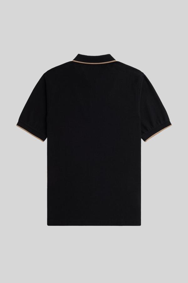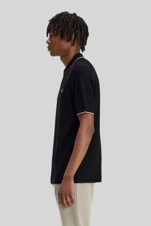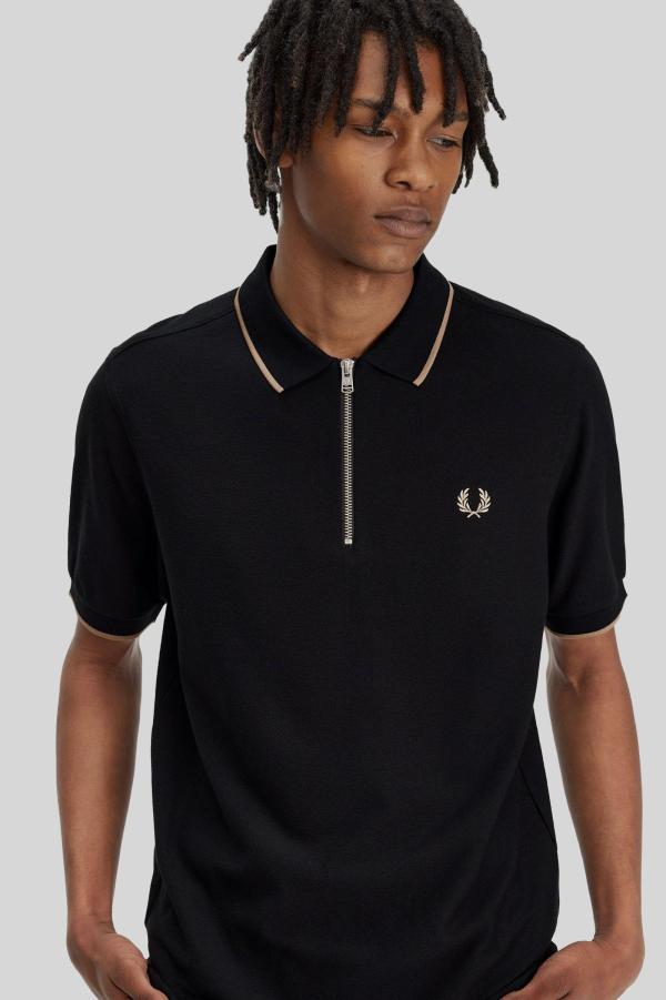 Polo Fred Perry ‘Crepe Pique Zip Neck Polo Shirt Black’. De polo met ritssluiting heeft een camelkleurige lauwerkrans en in dezelfde kleur een streep in de kraag en onderaan de mouw. De polo is gemaakt van een mooie crèpe stof. Het model van de polo is regular fit.