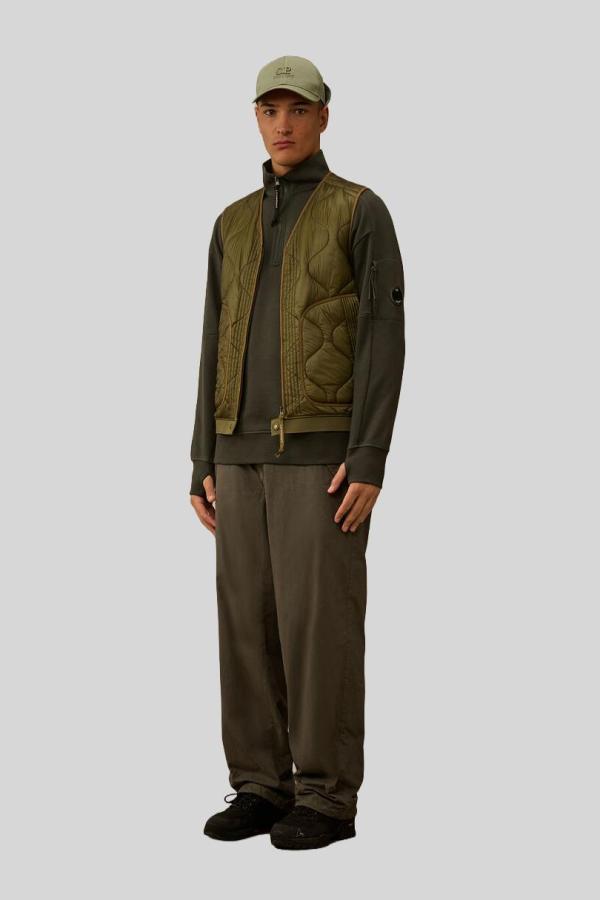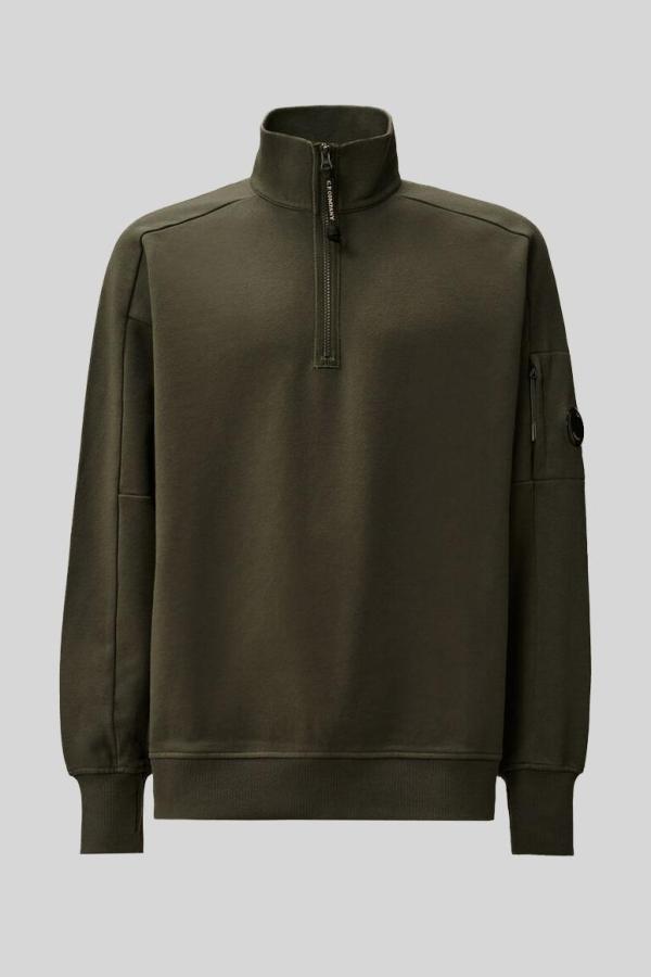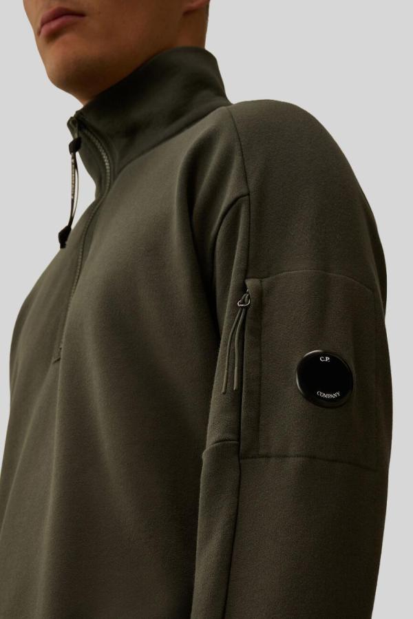 De Polo Collar Diagonal Raised Fleece Sweatshirt van C.P. Company in Dark Shadow is een grijze sweater met opstaande kraag en ritssluiting. Gemaakt van zacht, comfortabel materiaal en voorzien van een mouwzak met ritssluiting en de iconische goggle. Perfect voor een stijlvolle casual uitstraling!