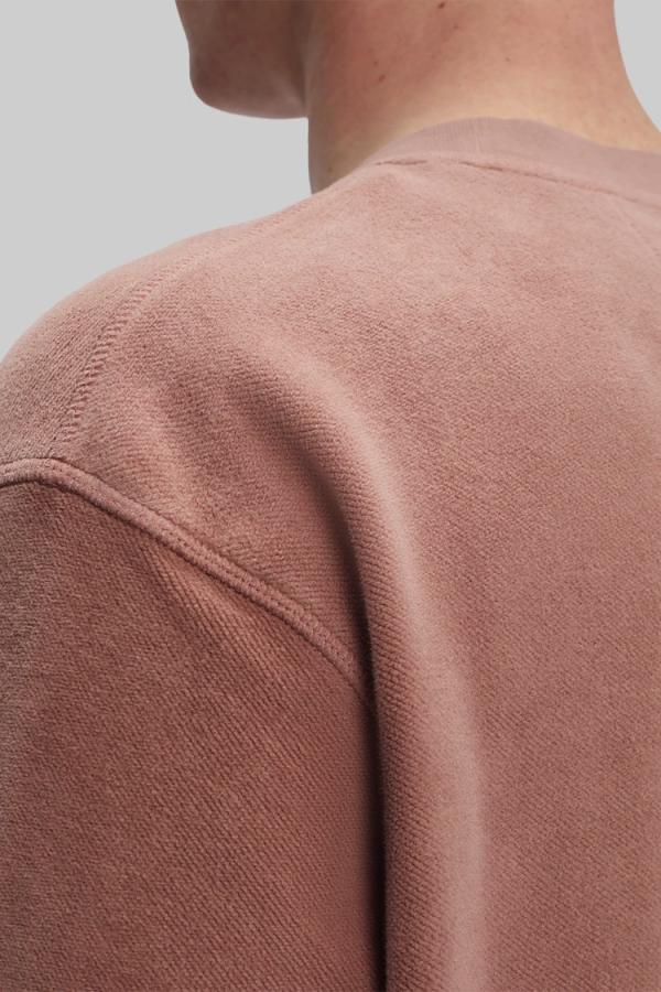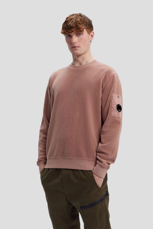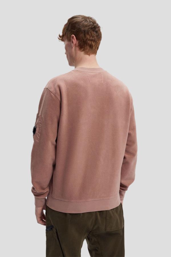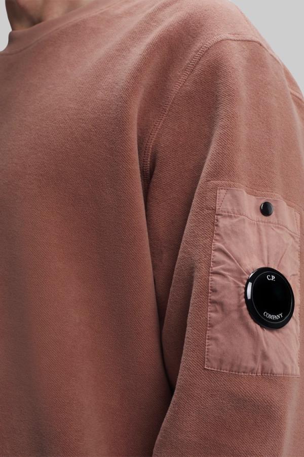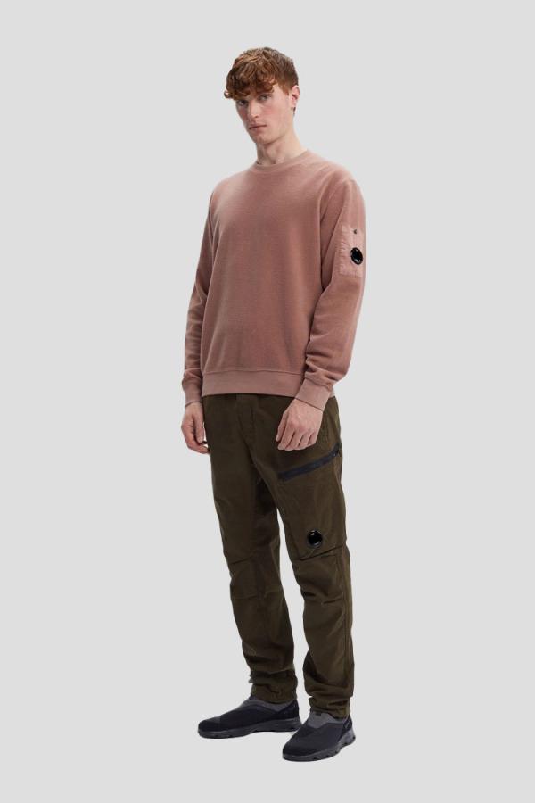 Sweater CP Company ‘Cedar wood’, ‘Brushed Diagonal’ met ronde hals en manchetten en boorden. De aardekleurigee trui is gemaakt van 100% katoen en heeft een diagonaal streepje in de stof en een zakje met knoopsluiting en goggle op de linkermouw. Het model is 186 cm / borstomvang 98-102 cm en draagt maat 50.