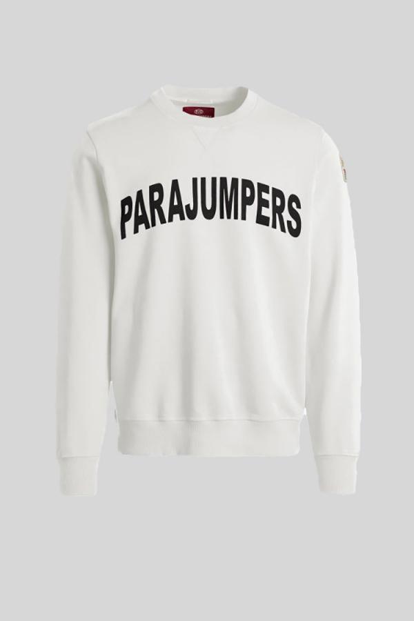 Sweater Parajumpers in model ‘Caleb’ in de kleur ‘Off-White’. De trui met de merknaam Parajumpers in zwarte letters op de borst, heeft het logo op de mouw.