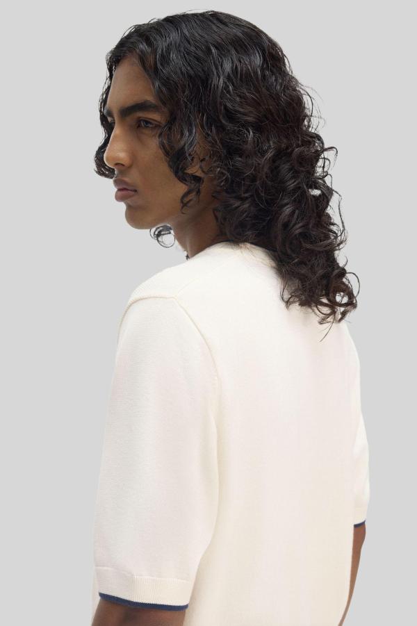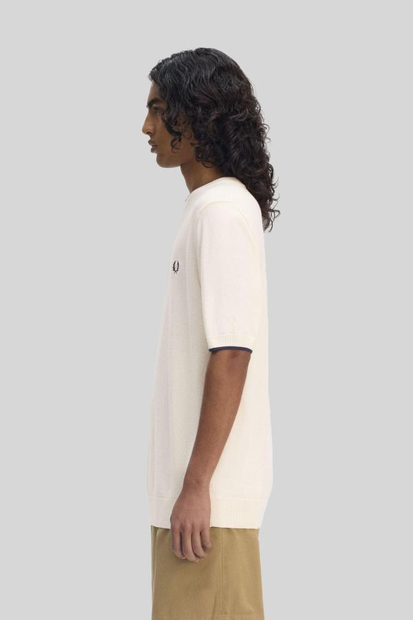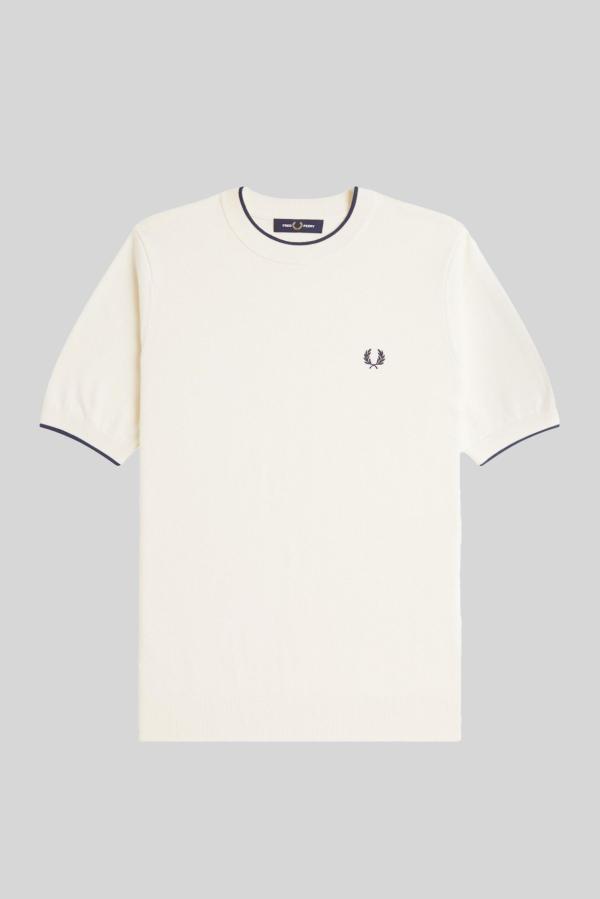 Texture Front Knitted T-shirt Fred Perry Ecru – een verfijnd T-shirt van 100% katoen met subtiele textuur. Geïnspireerd door het iconische M3-tennisshirt uit 1952, vertaald naar streetwear. Regular fit, geribde boorden, een crew neck met donkerblauwe tipping en een geborduurde lauwerkrans op de borst. Tijdloos en stijlvol!