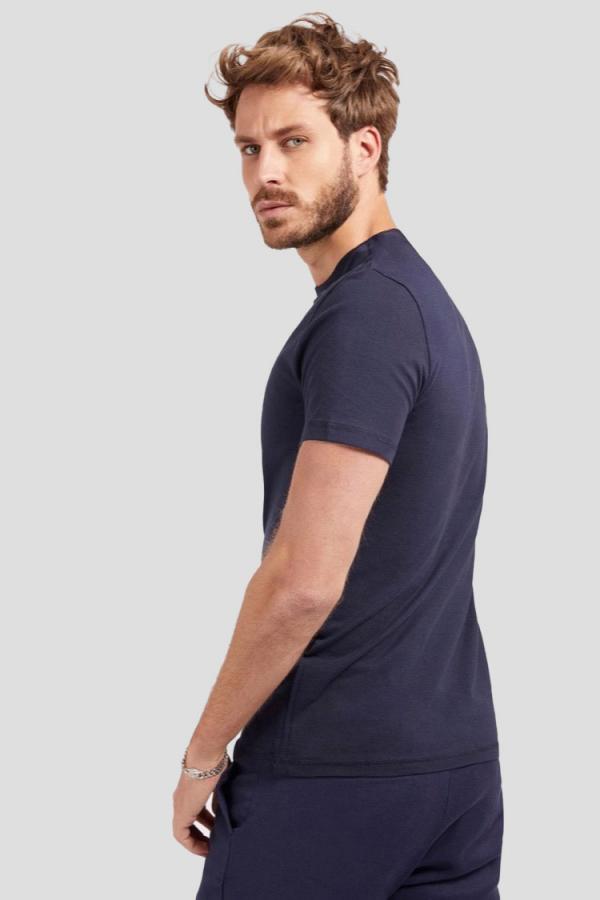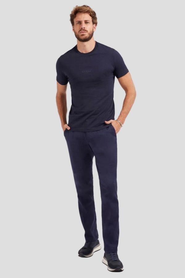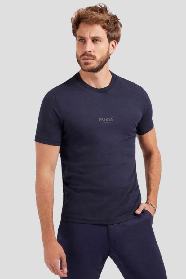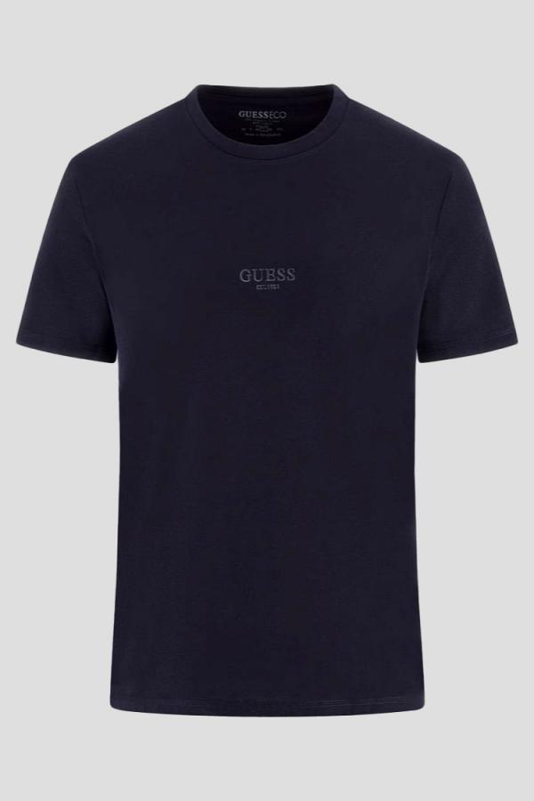 T-shirt Guess blauw in een slim fit model met merknaam op de borst. Het t-shirt uit de herencollectie van Guess is gemaakt van 100% katoen (50% organische katoen en 50% katoen).