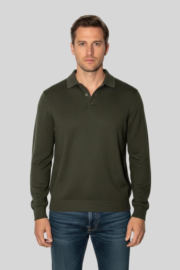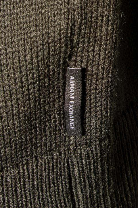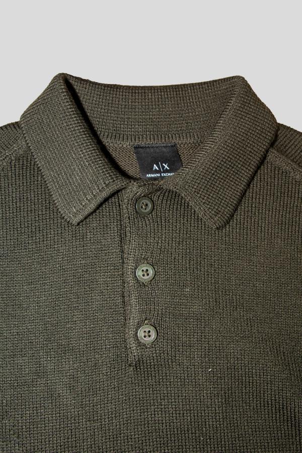 Armani Exchange gebreide polotrui in de kleur ‘Peat’ – Warme, diep donkergroene wintertrui met klassieke knoopsluiting. Gemaakt van een zachte mix van wol, katoen en nylon voor comfort, warmte en een tijdloze, stijlvolle uitstraling!