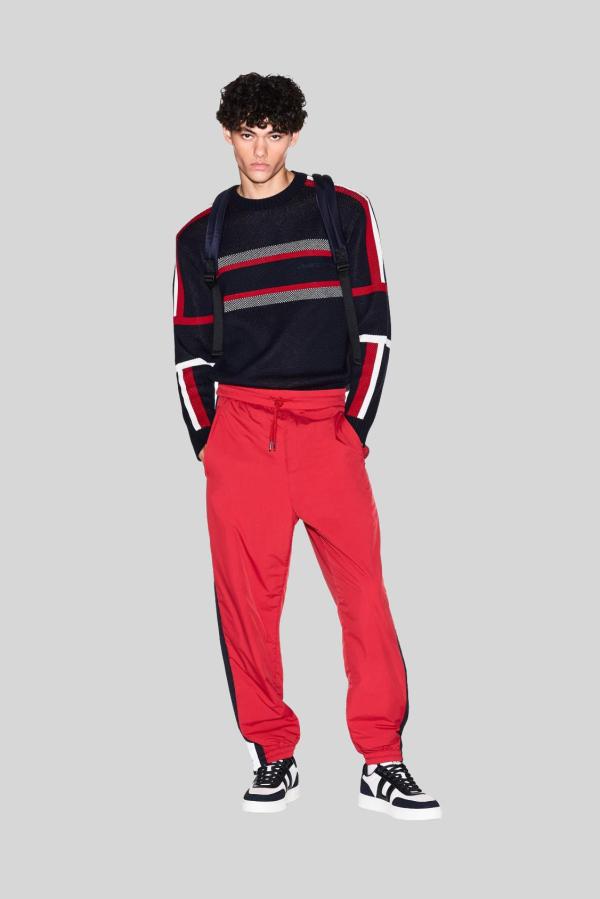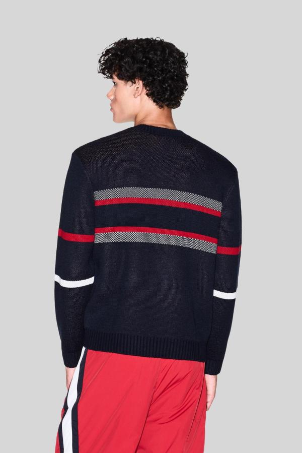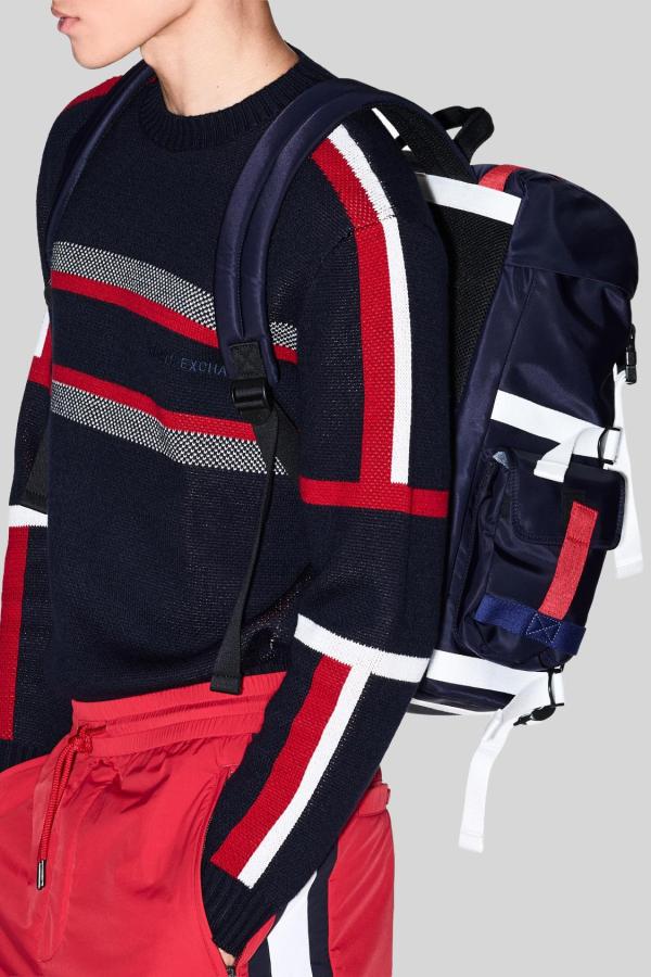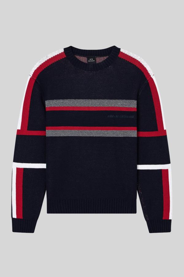 Armani Exchange trui in ‘deep navy/haute red’ met verticale rood/witte strepen, ideaal voor herfst en winter. Gemaakt van wol, katoen en acryl, met subtiel toon-op-toon merkembleem op de borst, biedt deze trui warmte, comfort en een stijlvolle, moderne uitstraling!