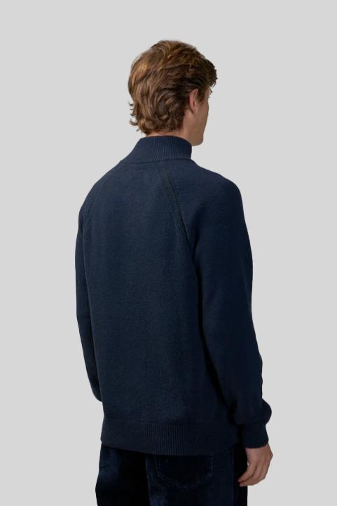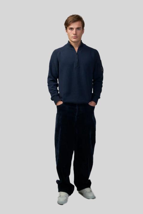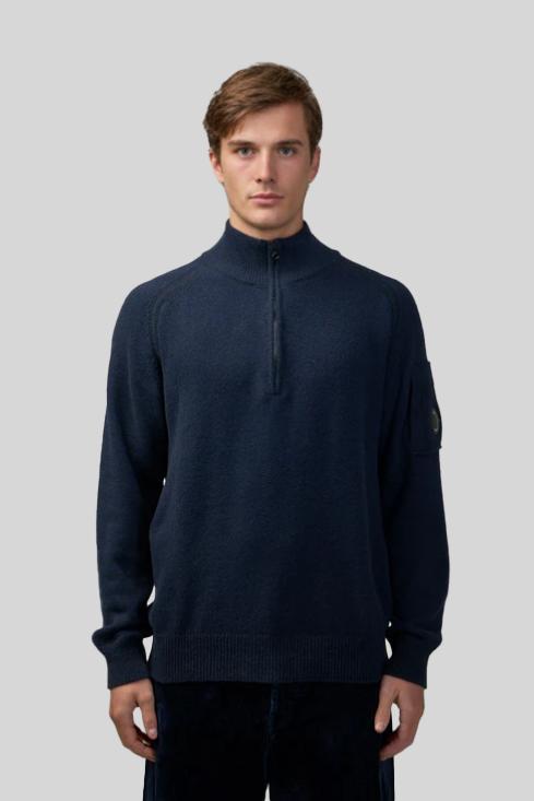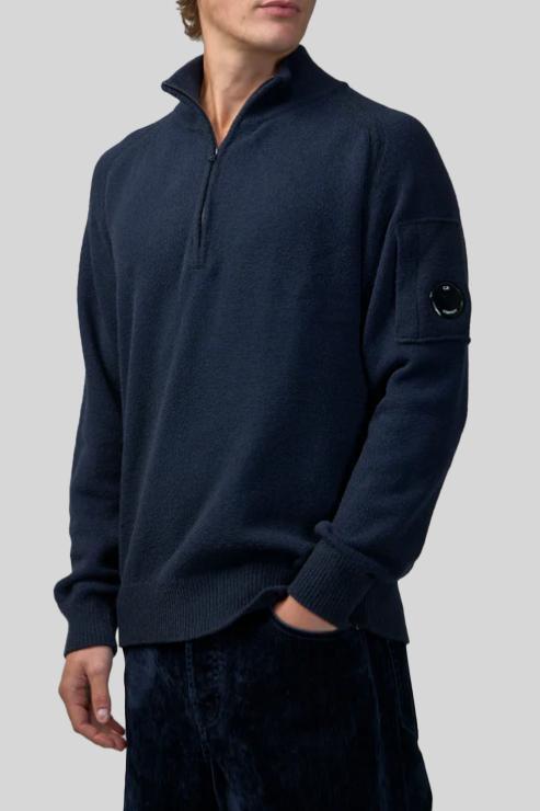De Knitwear Polo Collar Fleece Knit van C.P. Company in de kleur Total Eclipse is een donkerblauwe trui met opstaande kraag en ritssluiting. Gemaakt van polyamide, wol en een vleugje elastaan voor extra comfort. Afgewerkt met een mouwzak met ritssluiting en de iconische goggle. Stoer, warm en stijlvol!